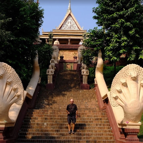 나무로 덮인 27m 높이의 언덕 꼭대기에 위치한 왓 프놈은 도시에서 유일한 언덕입니다. 전설에 따르면, 이 위치의 첫 번째 탑은 1373년에 메콩 강 물가에 이곳에 묻힌 4개의 부처상을 안치하기 위해 세워졌으며 Penh라는 여성이 발견했습니다. 이 펜이라는 여성으로 인해 수도 프놈펜의 이름이 정해 졌습니다. 왓 프놈의 주요 입구는 사자와 나가(뱀) 난간이 지키고 있는 웅장한 동쪽 계단을 통해 있습니다.