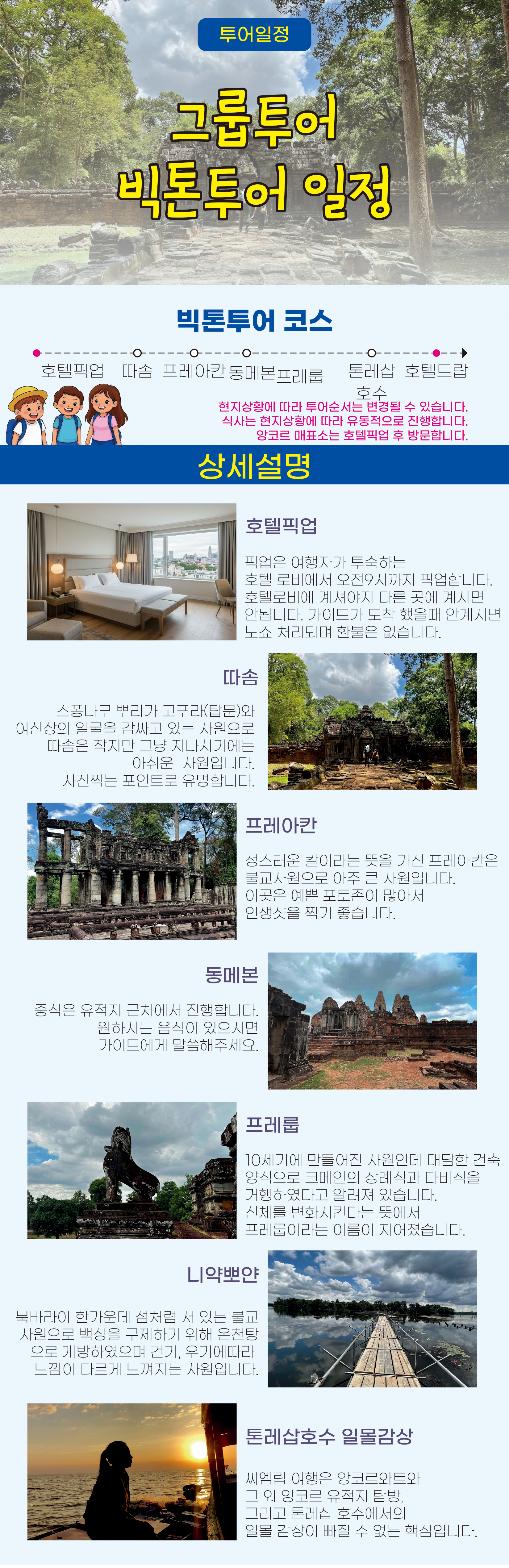 빅톤투어는 앙코르 톰 외곽에 있는 유적지 대부분을 투어할수 있습니다. 프레아칸, 니악뽀안, 프레룹사원 등을 오전 오후로 나누어 투어합니다. 마지막으로 톤레삽호수까지 투어하는 상품입니다. 자연과 인공미의 조화를 구경 하실수 있습니다. 단 시간에 많은 것을 보기에 약간의 체력이 필요합니다. 숙련된 한국어 가이드와 함께 한다면 멋진 포토존과 힌두신화와 크메르 역사이야기등으로 아주 재미난 투어를 즐길수 있습니다.