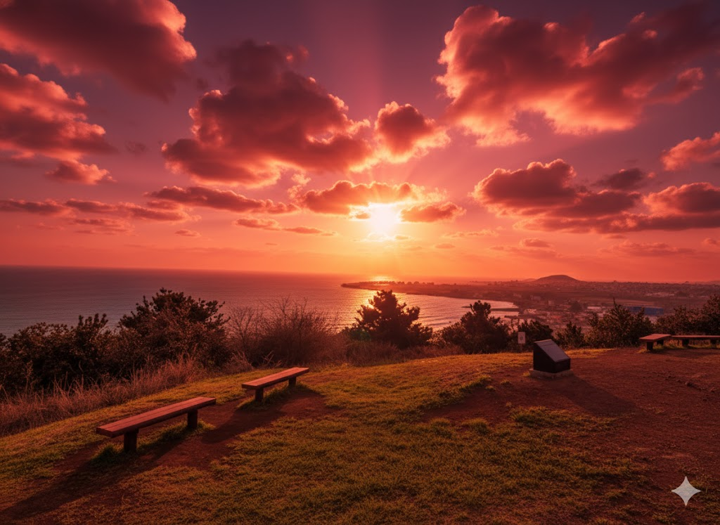 도두봉은 제주 공항 근처에 위치한 나지막한 오름(해발 약 65m)으로, 정상까지 10분 내외로 쉽게 오를 수 있습니다. 이곳은 제주도의 일출과 일몰 명소로 유명하며, 특히 아침 일출 시간에는 바다 위로 떠오르는 해와 제주시, 그리고 바로 아래 제주 국제공항의 활주로를 한눈에 조망하는 입체적인 풍경이 압권입니다. 짧은 시간에 제주 여행의 시작이나 마무리를 드라마틱한 일출로 장식하고 싶은 여행객들에게 최고의 선택지입니다.