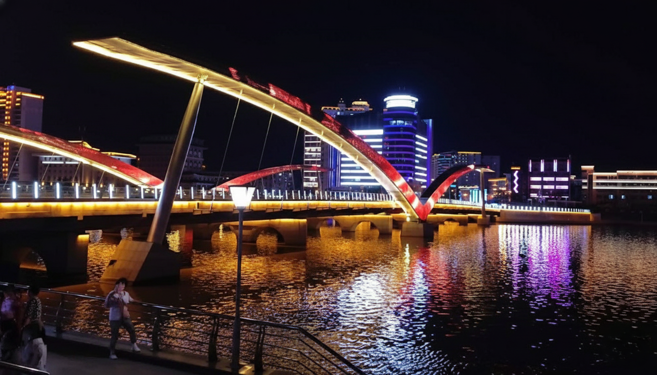 천지대교는 연길 시내를 가로지르는 부르하통하(布尔哈通河) 위에 놓인 다리입니다. 특히 밤이 되면 다리에 설치된 LED 조명이 화려하게 켜지면서 아름다운 야경 명소로 변모합니다. 다리 자체의 조명뿐만 아니라, 강물에 비치는 빛과 주변 건물들의 조명이 어우러져 연길 시민과 관광객들에게 낭만적인 밤 산책 코스를 제공합니다. 천지대교와 부르하통하 주변 야경은 연길의 현대적이고 활기찬 분위기를 상징합니다.