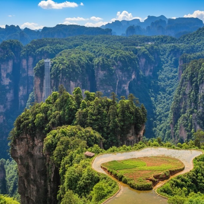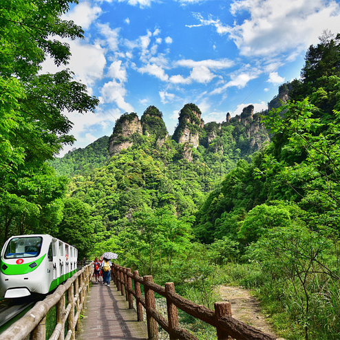 백룡 엘리베이터는 장가계 원가계(袁家界) 지역에 위치한 초대형 관광용 엘리베이터입니다. 높이 약326km의 절벽을 수직으로 깎아 만들어진 이 엘리베이터는 세계에서 가장 높고, 가장 빠르며, 가장 많은 하중을 운반하는 옥외 관광용 엘리베이터로 기네스북에 등재되었습니다. 하행 시에는 천자산, 원가계 관광을 마친 후 산 정상부에서 산 아래 수경 사구역(水绕四门) 방향으로 단 1분30초만에 하산하는 짜릿함과 웅장한 절벽 풍경을 동시에 경험할 수 있습니다.