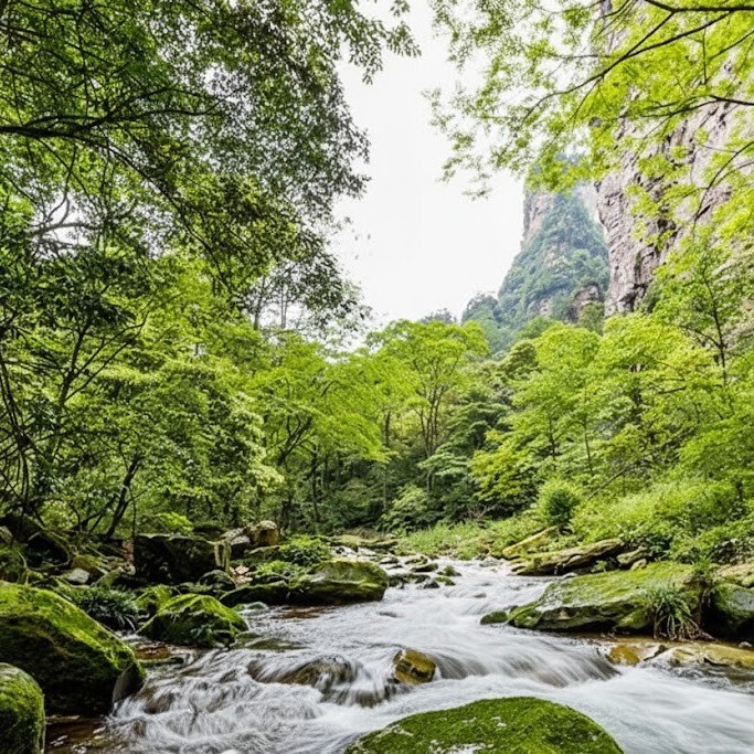 금편계곡(金鞭溪)은 장가계 무릉원 풍경구 내의 가장 아름다운 계곡 트레킹 코스입니다. 약 $7.5km 길이의 이 계곡은 금편암이라는 기묘한 봉우리 옆을 흐르는 맑은 물 때문에 이름이 붙었습니다. 계곡을 따라 평탄한 길이 이어져 왕복 3~4시간 동안 편안하게 산책할 수 있습니다. 맑은 계곡물, 푸르른 숲, 그리고 하늘을 찌를 듯한 석봉들이 어우러져 '인간 선경(仙境)'이라 불릴 만큼 아름답고 평화로운 풍경을 자랑합니다.