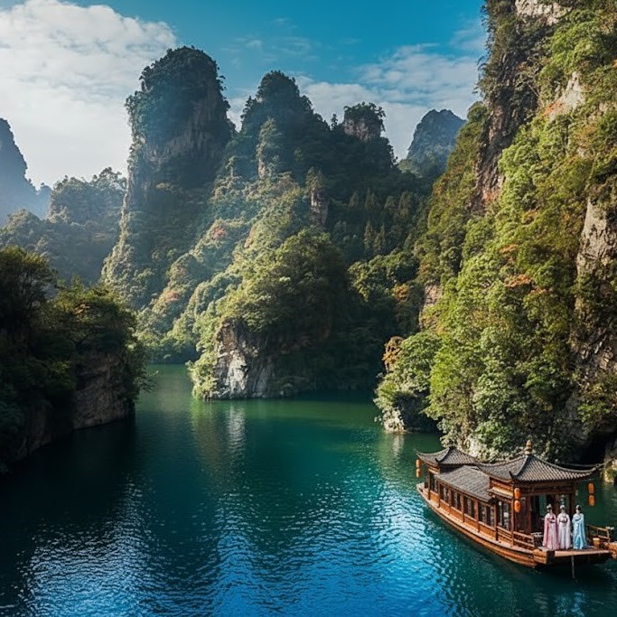 보봉호(寶峰湖)는 장가계 무릉원 풍경구 내에 위치한 반자연, 반인공 호수입니다. 원래는 협곡이었으나, 댐을 건설하여 물을 가두면서 현재의 아름다운 호수가 조성되었습니다. 관광객들은 VIP 통로를 통해 입장한 후, 호수 위를 운항하는 유람선에 탑승하여 주변의 깎아지른 듯한 석봉과 푸른 호수가 어우러진 경치를 감상합니다. 유람선 위에서 토가족 처녀들이 부르는 전통 민요를 듣는 것도 이곳만의 특별한 낭만입니다.