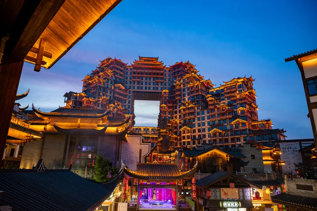 72기루는 장가계 시내에 위치한 복합 문화 상업 지구로, **천문산의 천문동(天门洞)**을 모티브로 하여 건축되었습니다. 장가계 야경의 성지로 불릴 만큼 저녁이 되면 화려한 조명이 건물을 수놓아 환상적인 분위기를 연출합니다. 특히 건축물의 외관은 장가계 토가족(土家族)의 전통 건축 양식을 현대적으로 재해석하여 독특하고 웅장한 느낌을 주며, 내부에는 음식점, 기념품 가게, 공연장 등이 있어 야간 관광 및 휴식을 즐기기 좋은 곳입니다
