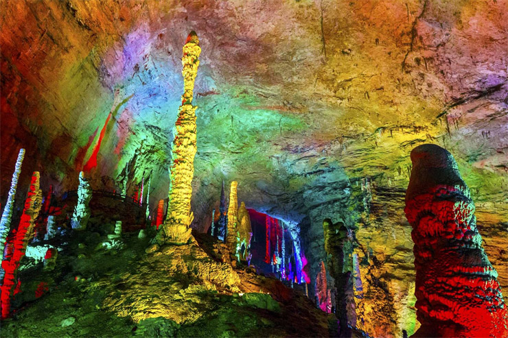 황룡동굴(黄龙洞)은 장가계 무릉원 풍경구 내에 위치한 거대한 석회암 종유동굴입니다. 동굴 내부에는 종유석, 석순, 석주 등이 화려하게 발달해 있어 지하 궁전이라 불립니다. 동굴 내부 관광 시에는 VIP 전동카를 이용하여 긴 통로를 이동하며, 맑은 지하수를 따라 배를 타고 이동하는 구간도 포함되어 있습니다. 조명을 받아 신비롭게 빛나는 석회암 지형과 웅장한 내부 공간은 장가계의 또 다른 매력을 보여주는 명소입니다.