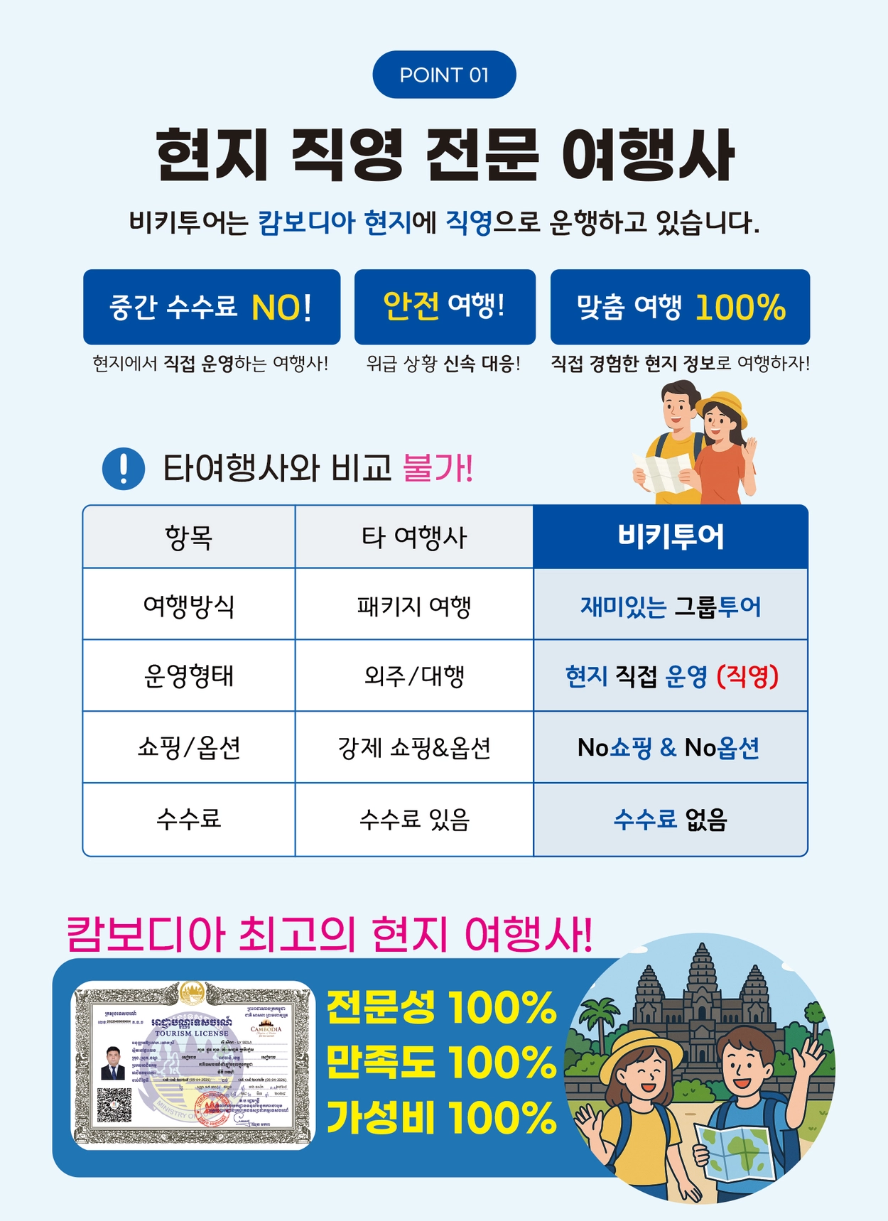 한국과 캄보디아 두 곳에 사업장이 있는 캄보디아 전문여행사입니다. 일반 손님뿐 아니라 비즈니스, 골프, 렌터카 등 다양한 손님에게 캄보디아에서 원하시는 서비스를 제공하는 여행사입니다. 방송국과의 협업도 있는 믿음직한 회사입니다. 여행에서 가장 중요한 것은 즐거움과 안전입니다. 저희 임직원은 여행객을 결코 난처한 상황을 만들지 않습니다. 그저 즐겁게 여행만 하시면 됩니다. 여행문의는 언제든지 해주세요. 감사합니다.